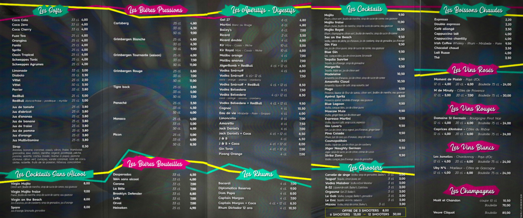 Consultez notre carte pour découvrir nos boissons, nos cocktails et nos pizzas.